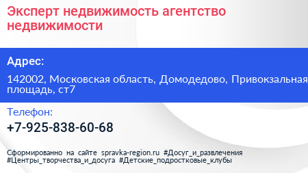 Эксперт недвижимость, агентство недвижимости по адресу 142002, Московская область, Домодедово, Привокзальная площадь, ст7 в дальнейшем Организация, размещена в следующих категориях: