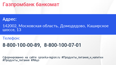 Газпромбанк, банкомат по адресу 142002, Московская область, Домодедово, Каширское шоссе, 13 в дальнейшем Организация, размещена в следующих категориях: