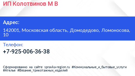 ИП Колотвинов М.В. по адресу 142001, Московская область, Домодедово, Ломоносова, 10 в дальнейшем Организация, размещена в следующих категориях: