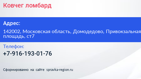 Ковчег, ломбард по адресу 142002, Московская область, Домодедово, Привокзальная площадь, ст7 в дальнейшем Организация, размещена в следующих категориях: