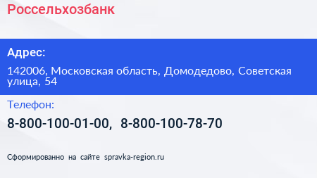 Россельхозбанк по адресу 142006, Московская область, Домодедово, Советская улица, 54 в дальнейшем Организация, размещена в следующих категориях:
