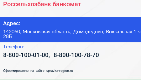 Россельхозбанк, банкомат по адресу 142060, Московская область, Домодедово, Вокзальная 1-я, 28Б в дальнейшем Организация, размещена в следующих категориях:
