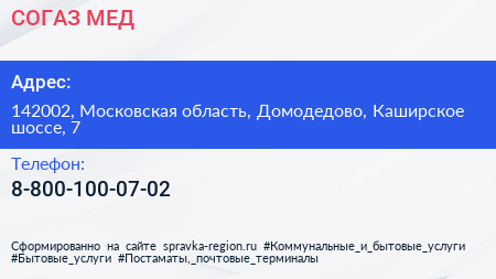 СОГАЗ-МЕД по адресу 142002, Московская область, Домодедово, Каширское шоссе, 7 в дальнейшем Организация, размещена в следующих категориях: