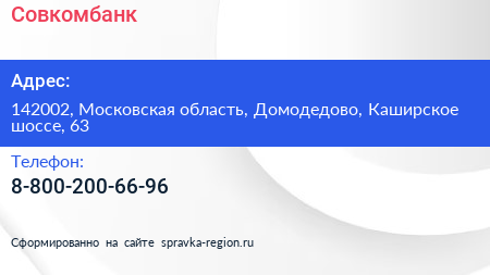 Совкомбанк по адресу 142002, Московская область, Домодедово, Каширское шоссе, 63 в дальнейшем Организация, размещена в следующих категориях: