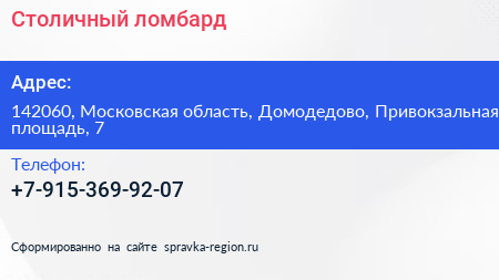 Столичный, ломбард по адресу 142060, Московская область, Домодедово, Привокзальная площадь, 7 в дальнейшем Организация, размещена в следующих категориях: