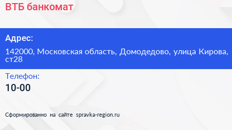 ВТБ, банкомат по адресу 142000, Московская область, Домодедово, улица Кирова, ст28 в дальнейшем Организация, размещена в следующих категориях: