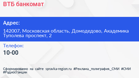 ВТБ, банкомат по адресу 142007, Московская область, Домодедово, Академика Туполева проспект, 2 в дальнейшем Организация, размещена в следующих категориях: