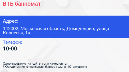 ВТБ, банкомат по адресу 142002, Московская область, Домодедово, улица Корнеева, 1а в дальнейшем Организация, размещена в следующих категориях: