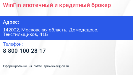 WinFin, ипотечный и кредитный брокер по адресу 142002, Московская область, Домодедово, Текстильщиков, 41Б в дальнейшем Организация, размещена в следующих категориях: