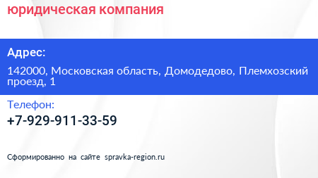 юридическая компания по адресу 142000, Московская область, Домодедово, Племхозский проезд, 1 в дальнейшем Организация, размещена в следующих категориях: