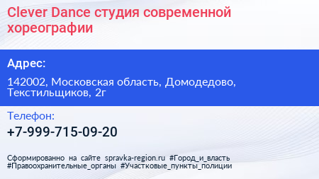 Clever Dance, студия современной хореографии по адресу 142002, Московская область, Домодедово, Текстильщиков, 2г в дальнейшем Организация, размещена в следующих категориях: