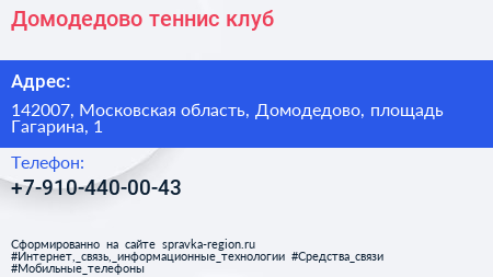 Домодедово, теннис-клуб по адресу 142007, Московская область, Домодедово, площадь Гагарина, 1 в дальнейшем Организация, размещена в следующих категориях: