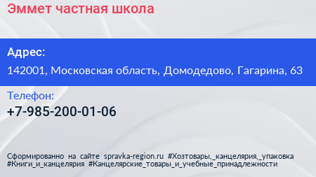 Эммет, частная школа по адресу 142001, Московская область, Домодедово, Гагарина, 63 в дальнейшем Организация, размещена в следующих категориях: