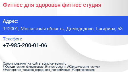 Фитнес для здоровья, фитнес-студия по адресу 142001, Московская область, Домодедово, Гагарина, 63 в дальнейшем Организация, размещена в следующих категориях:
