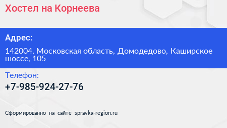 Хостел на Корнеева по адресу 142004, Московская область, Домодедово, Каширское шоссе, 105 в дальнейшем Организация, размещена в следующих категориях: