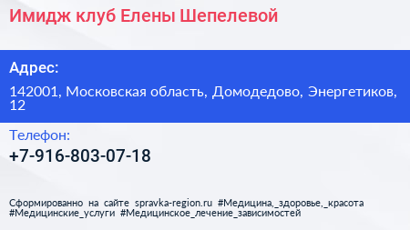 Имидж-клуб Елены Шепелевой по адресу 142001, Московская область, Домодедово, Энергетиков, 12 в дальнейшем Организация, размещена в следующих категориях: