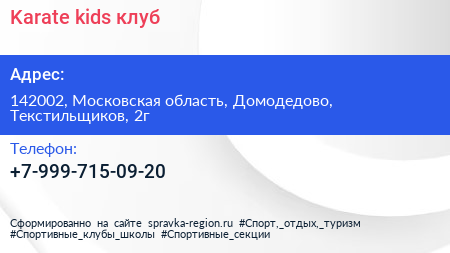 Karate kids, клуб по адресу 142002, Московская область, Домодедово, Текстильщиков, 2г в дальнейшем Организация, размещена в следующих категориях: