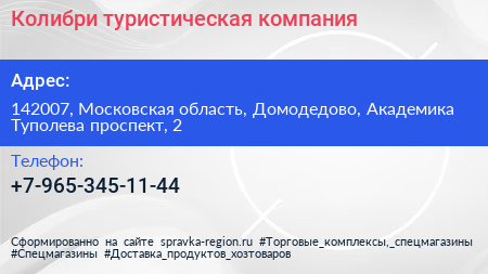 Колибри, туристическая компания по адресу 142007, Московская область, Домодедово, Академика Туполева проспект, 2 в дальнейшем Организация, размещена в следующих категориях: