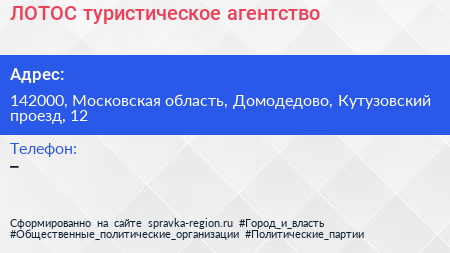 ЛОТОС, туристическое агентство по адресу 142000, Московская область, Домодедово, Кутузовский проезд, 12 в дальнейшем Организация, размещена в следующих категориях: