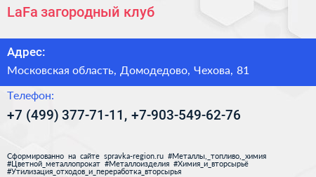 LaFa, загородный клуб по адресу Московская область, Домодедово, Чехова, 81 в дальнейшем Организация, размещена в следующих категориях:
