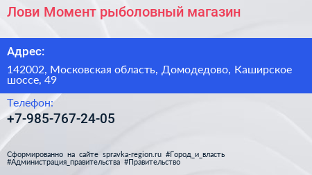 Лови Момент, рыболовный магазин по адресу 142002, Московская область, Домодедово, Каширское шоссе, 49 в дальнейшем Организация, размещена в следующих категориях: