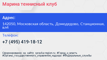 Марина, теннисный клуб по адресу 142050, Московская область, Домодедово, Станционная, вл4 в дальнейшем Организация, размещена в следующих категориях: