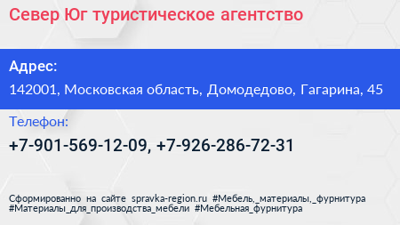 Север Юг, туристическое агентство по адресу 142001, Московская область, Домодедово, Гагарина, 45 в дальнейшем Организация, размещена в следующих категориях: