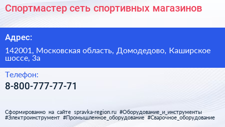Спортмастер, сеть спортивных магазинов по адресу 142001, Московская область, Домодедово, Каширское шоссе, 3а в дальнейшем Организация, размещена в следующих категориях: