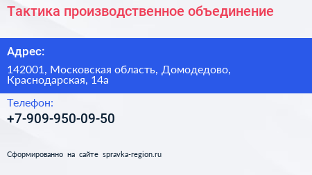 Тактика, производственное объединение по адресу 142001, Московская область, Домодедово, Краснодарская, 14а в дальнейшем Организация, размещена в следующих категориях: