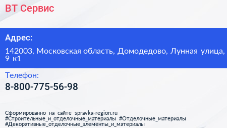 ВТ-Сервис по адресу 142003, Московская область, Домодедово, Лунная улица, 9 к1 в дальнейшем Организация, размещена в следующих категориях: