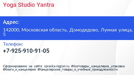 Yoga Studio Yantra по адресу 142000, Московская область, Домодедово, Лунная улица, 5 в дальнейшем Организация, размещена в следующих категориях: