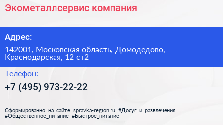 Экометаллсервис, компания по адресу 142001, Московская область, Домодедово, Краснодарская, 12 ст2 в дальнейшем Организация, размещена в следующих категориях: