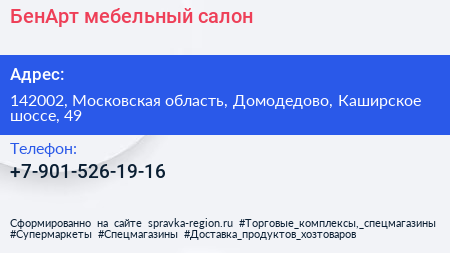 БенАрт, мебельный салон по адресу 142002, Московская область, Домодедово, Каширское шоссе, 49 в дальнейшем Организация, размещена в следующих категориях: