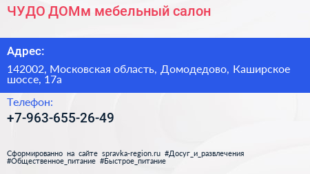 ЧУДО ДОМм, мебельный салон по адресу 142002, Московская область, Домодедово, Каширское шоссе, 17а в дальнейшем Организация, размещена в следующих категориях: