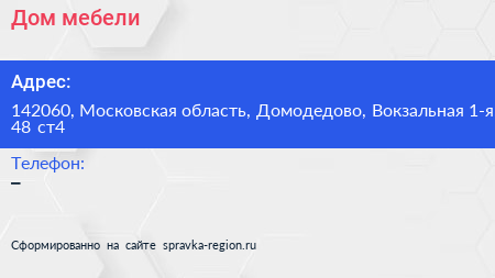 Дом мебели по адресу 142060, Московская область, Домодедово, Вокзальная 1-я, 48 ст4 в дальнейшем Организация, размещена в следующих категориях: