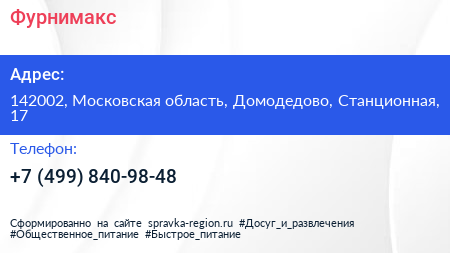 Фурнимакс по адресу 142002, Московская область, Домодедово, Станционная, 17 в дальнейшем Организация, размещена в следующих категориях: