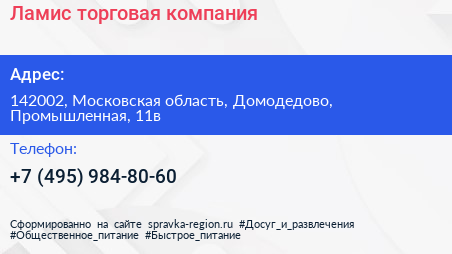 Ламис, торговая компания по адресу 142002, Московская область, Домодедово, Промышленная, 11в в дальнейшем Организация, размещена в следующих категориях: