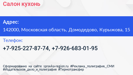 Салон кухонь по адресу 142000, Московская область, Домодедово, Курыжова, 15 в дальнейшем Организация, размещена в следующих категориях: