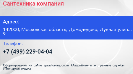 Сантехника, компания по адресу 142000, Московская область, Домодедово, Лунная улица, 9 в дальнейшем Организация, размещена в следующих категориях: