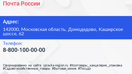 Почта России по адресу 142000, Московская область, Домодедово, Каширское шоссе, 62 в дальнейшем Организация, размещена в следующих категориях: