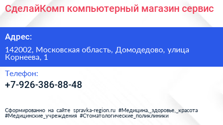 СделайКомп, компьютерный магазин-сервис по адресу 142002, Московская область, Домодедово, улица Корнеева, 1 в дальнейшем Организация, размещена в следующих категориях: