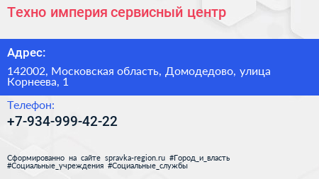 Техно-империя, сервисный центр по адресу 142002, Московская область, Домодедово, улица Корнеева, 1 в дальнейшем Организация, размещена в следующих категориях: