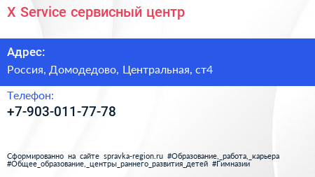 X Service, сервисный центр по адресу Ozon, 4, Центральная улица, коттеджный поселок Берег ФМ, Растуново, городской округ Домодедово, Московская область, Центральный федеральный округ, 142060, Россия в дальнейшем Организация, размещена в следующих категориях: