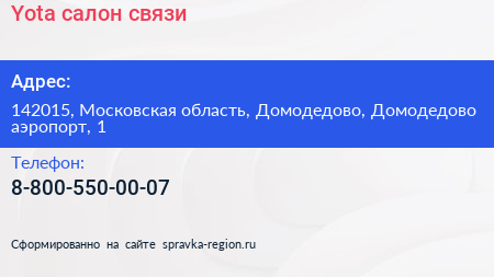 Yota, салон связи по адресу 142015, Московская область, Домодедово, Домодедово аэропорт, 1 в дальнейшем Организация, размещена в следующих категориях: