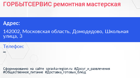ГОРБЫТСЕРВИС, ремонтная мастерская по адресу 142002, Московская область, Домодедово, Школьная улица, 3 в дальнейшем Организация, размещена в следующих категориях: