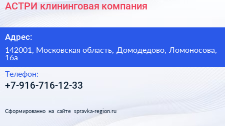 АСТРИ, клининговая компания по адресу 142001, Московская область, Домодедово, Ломоносова, 16а в дальнейшем Организация, размещена в следующих категориях: