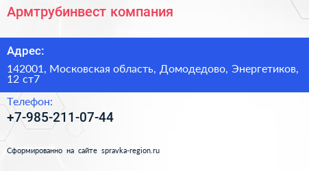 Армтрубинвест, компания по адресу 142001, Московская область, Домодедово, Энергетиков, 12 ст7 в дальнейшем Организация, размещена в следующих категориях: