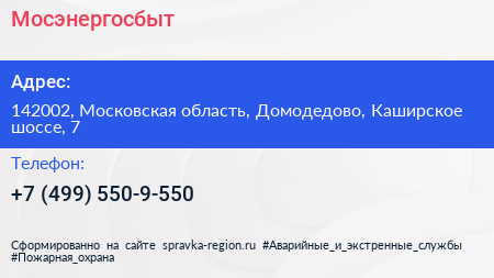 Мосэнергосбыт по адресу 142002, Московская область, Домодедово, Каширское шоссе, 7 в дальнейшем Организация, размещена в следующих категориях: