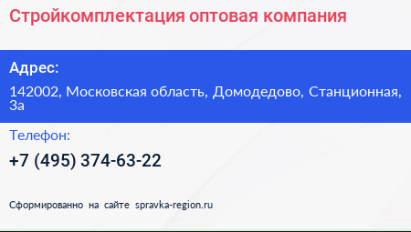Стройкомплектация, оптовая компания по адресу 142002, Московская область, Домодедово, Станционная, 3а в дальнейшем Организация, размещена в следующих категориях: