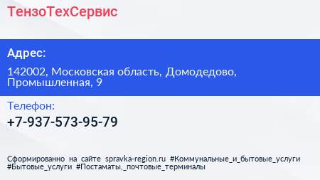 ТензоТехСервис по адресу 142002, Московская область, Домодедово, Промышленная, 9 в дальнейшем Организация, размещена в следующих категориях: